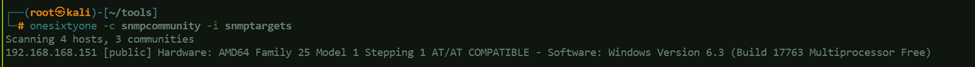OneSixtyOne is used to brute force SNMP community string.onesixtyone -c <COMMUNITY_LIST_FILE> -i <TARGET_IP_LIST_FILE>