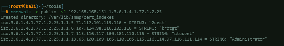 Using SNMPwalk to find more information about the target server using the discovered community string (public).snmpwalk -c public -v1 <TARGET_IP_ADDRESS> <SNMP_MIB_VALUE>