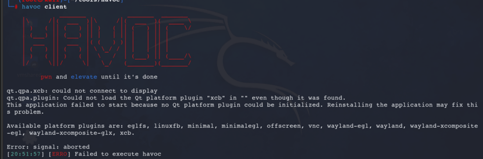 - When I initially attempted the installation, I followed the steps for Kali in the Havoc’s Documentation page. I cannot get past through running Havoc client. So I uninstalled and reinstalled it using the same steps. However, I still get this error: qt.qpa.xcb: could not connect to display