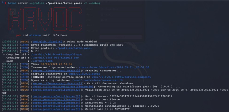 To run the Team Server, use this command:havoc server --profile /<HAVOC_DIRECTORY>/profiles/havoc.yaotl -v --debug