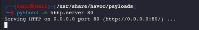 The contents of this directory, from which we run the Python HTTP server, will be displayed when the Havoc C2’s IP address (or URL, if configured with a DNS entry) is accessed.