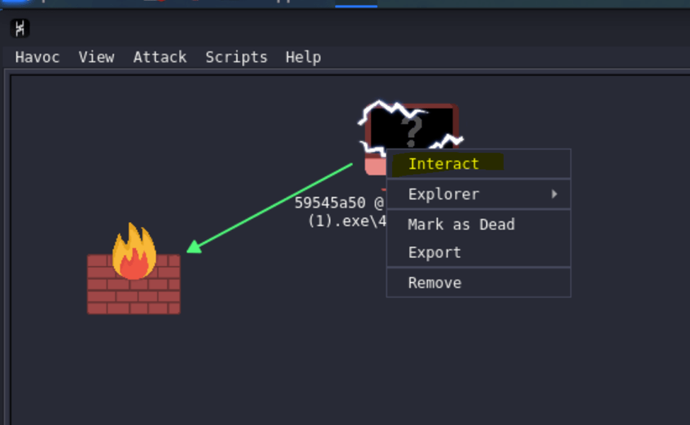 In a C2, interacting with the victim machine means sending commands, running applications or exfiltrating data. To interact, right click the victim machine’s icon and select Interact.