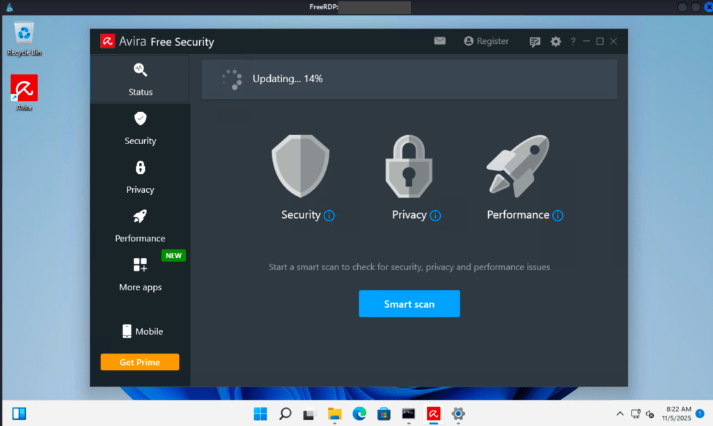 Upon logging in to the Windows VM, Avira AV is already installed.