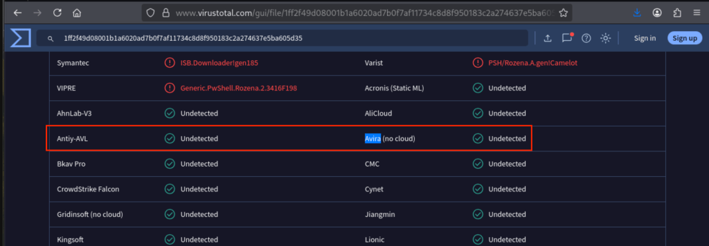 Once payload is ready, upload it to VirusTotal to check if this will be flagged by Avira.