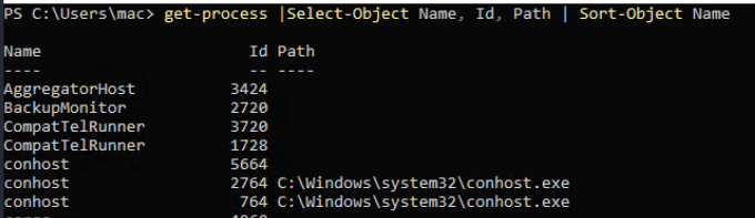 Get-Process | Select-Object Name, Id, Path | Sort-Object Name