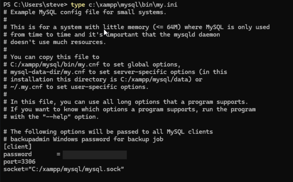 Steve’s credential will allow successful RDP connection. Once logged in to the target system, open Powershell and try if user steve has permission to view the contents of the my.ini file inside the XAMPP installation folder.