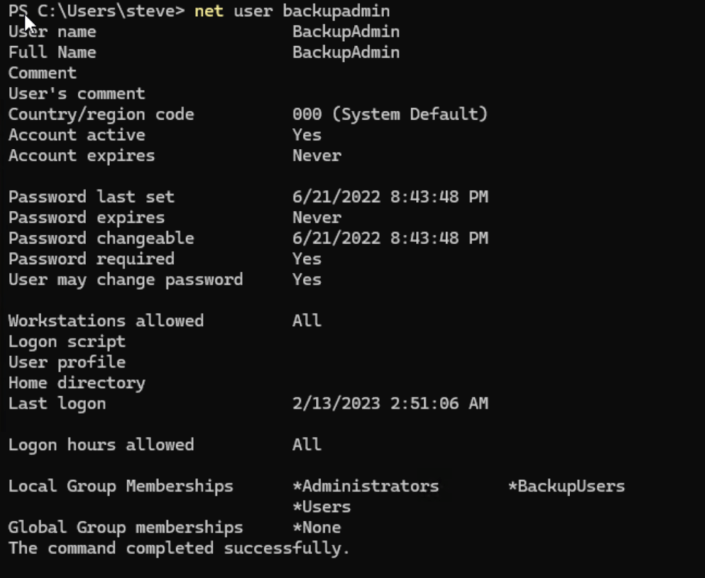 This will give out more information about the user. This includes the local group membership, which reveals that backupadmin is a member of Administrators local group.