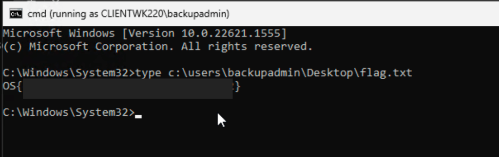 Since we were able to get the password for user backupadmin in Step 4, we’ll use runas to run cmd as backupadmin: