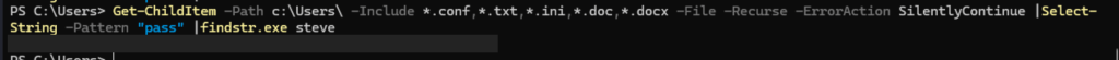 Get-ChildItem -Path C:\Users -Include *.txt,*.ini -File -Recurse -ErrorAction SilentlyContinue | Select-String -Pattern "pass" | findstr.exe steve