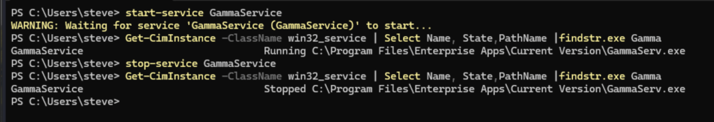 Get-CimInstance -ClassName win32_service | Select Name,State,PathName | findstr.exe 'Gamma'