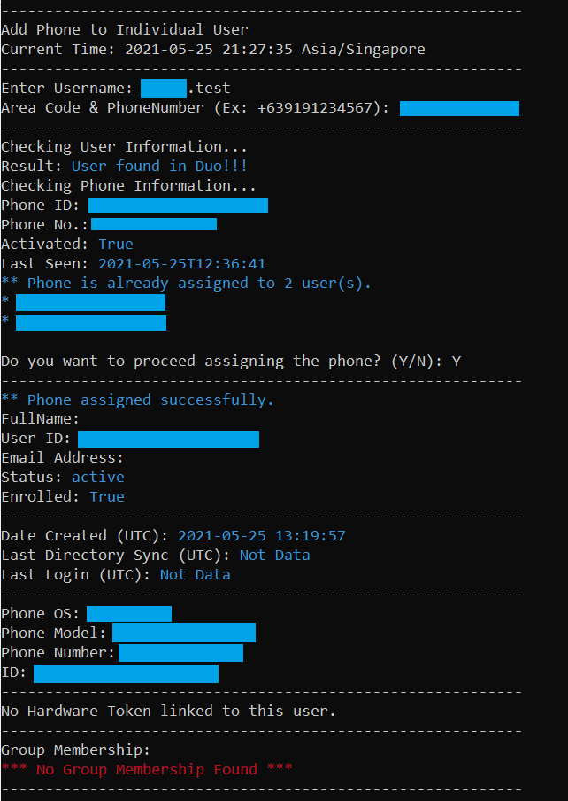 Adding a new phone to a user: If the phone is not yet existing in Duo, the script creates the phone, then adds it after user’s confirmation.