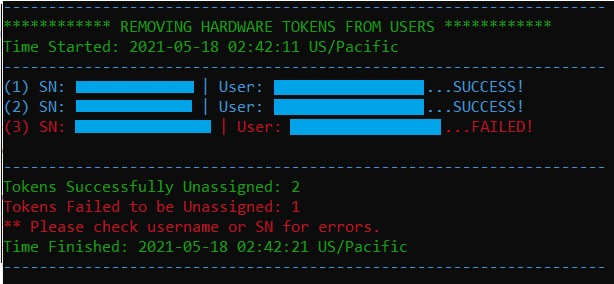 # imports for the Duo Admin API calls import duo_client import csv import sys import pytz from pytz import timezone from datetime import datetime, timedelta from colorama import init from colorama import Fore, Back, Style # imports IKEY, SKEY, and API Hostname stored in another file from my_duo_keys import * admin_api = duo_client.Admin(ikey=DUO_IKEY, skey=DUO_SKEY, host=DUO_APIHOSTNAME) init() print(" ") tz_PST = timezone('Asia/Singapore') sa_time = datetime.now(tz_PST) current_time = (sa_time.strftime('%Y-%m-%d %H:%M:%S') + " " + str(tz_PST)) print(Fore.CYAN + "-------------------------------------------------------------------") print(Fore.GREEN + "************ REMOVING HARDWARE TOKENS FROM USERS ************") print(Fore.GREEN + "Time Started: " + current_time) print(Fore.CYAN + "-------------------------------------------------------------------") # open the CSV file and read from it line-by-line until the end of the file with open('token_unassign.csv') as csvfile: reader = csv.reader(csvfile) next(reader, None) count = 1 success=0 failed=0 for row in reader: tokenserial = row[0] username=row[1] tokentype=row[2] try: user_id = admin_api.get_users_by_name(username=username) for a in user_id: user_id = a['user_id'] token_id = admin_api.get_tokens_by_serial(type=tokentype,serial=tokenserial) for b in token_id: token_id=b['token_id'] admin_api.delete_user_token(user_id,token_id) print(Fore.CYAN + "(" + str(count) + ") " + "SN: " + tokenserial + " | User: " + username + " ...SUCCESS!") count += 1 success += 1 # handles errors that may come up due to the API calls above # the variable 'e' is the error and calling print(e) will display the error message except Exception as e: print(Fore.RED + "(" + str(count) + ") " + "SN: " + tokenserial + " | User: " + username + " ...FAILED!") count += 1 failed += 1 print(" ") tz_PST = timezone('US/Pacific') sa_time = datetime.now(tz_PST) current_time = (sa_time.strftime('%Y-%m-%d %H:%M:%S') + " " + str(tz_PST)) print(Fore.CYAN + "-------------------------------------------------------------------") print(Fore.GREEN + "Tokens Successfully Unassigned: " + str(success)) if failed > 0: print(Fore.RED + "Tokens Failed to be Unassigned: " + str(failed)) print(Fore.RED + "** Please check username or SN for errors.") print(Fore.GREEN + "Time Finished: " + current_time) print(Fore.CYAN + "-------------------------------------------------------------------")