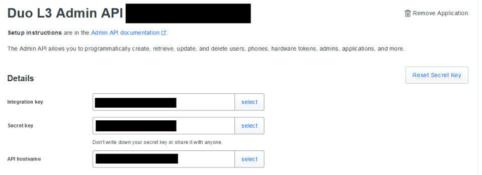 DUO_IKEY = "INTEGRATION KEY FROM YOUR PROTECTED APPLICATION" DUO_SKEY = "SECRET KEY FROM YOUR PROTECTED APPLICATION" DUO_APIHOSTNAME = "API HOSTNAME FROM YOUR PROTECTED APPLICATION"