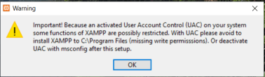 - Upon running the installer, you will normally get this prompt if you are running the User Access Control. It tells you not to install XAMPP in the Program Files folder. Just click OK.