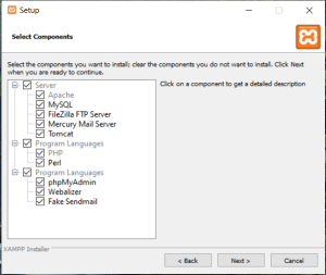 - Select the components you need. If you are creating a web server, you basically just need Apache, MySQL and phpMyAdmin. Click “Next” once needed components are selected.