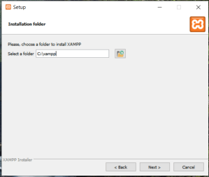 - Go back to the installation. It will ask where to install XAMPP. Select the folder you have created from the previous step.
