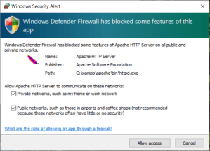 - You might be getting prompts like one below. Just select the “Allow Access”. It will allow the XAMPP application to connect to the public and private networks of your computer.