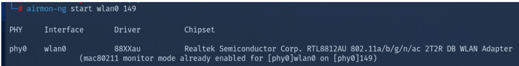 Run aircrack in monitor mode. in the screenshot below, selected channel is 149 airmon-ng start wlan0 149 In this example, the name of the wireless adapter is wlan0 and the channel you have selected is 149