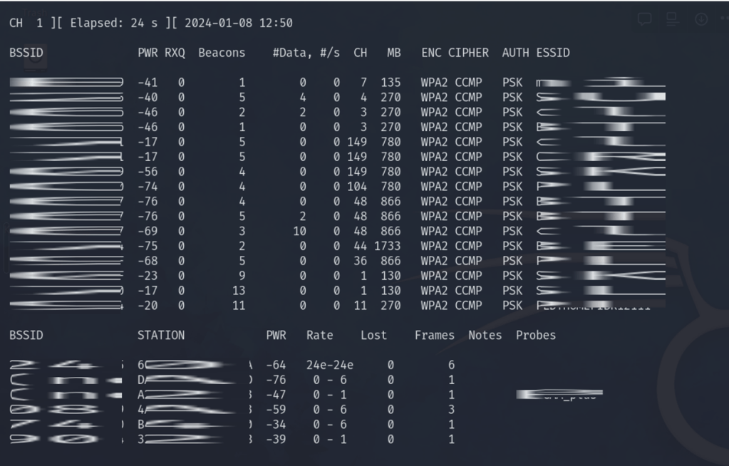 Run the airodump-ng to start monitoring wireless networks and collect wireless authentication handshake. airodump-ng -c 11 –bssid XX:XX:XX:XX:XX:XX -w psk wlan0 In this example, the command monitors channel 11 and a specific access point with the given mac address after the condition bssid.