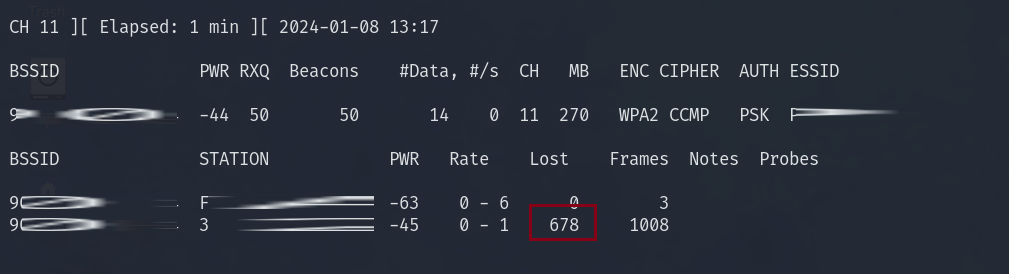 While you are running the deauth, notice that the number in the lost column will suddenly increase at great rate. This happens at the same time the client gets disconnected from the wireless network.